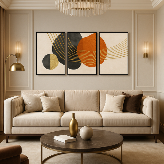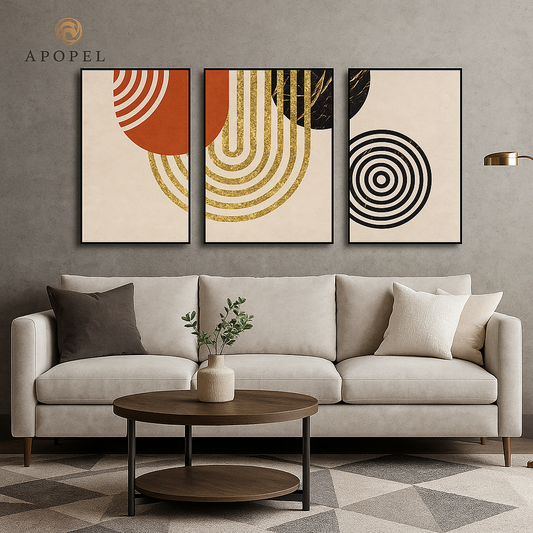 Set of 3 Geometric Harmony Canvas Art – Walnut Framed Mid Century